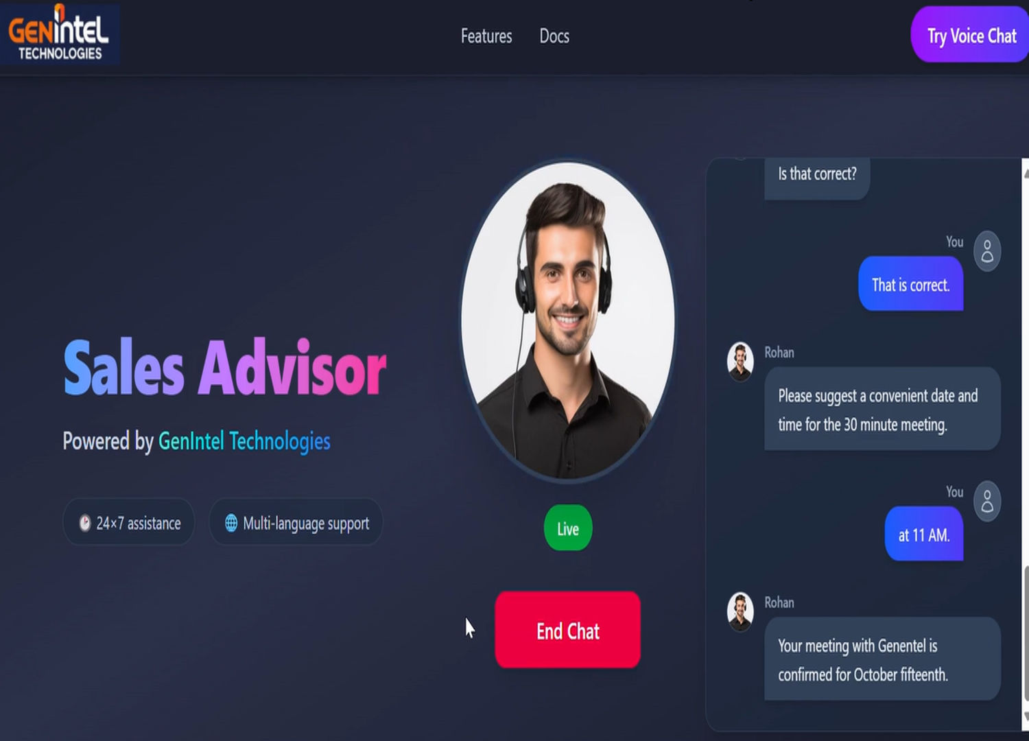 Slots: 10:00 to 21:00 (1-hour start slots). Confirmation will be emailed to maneesh.kale@genintel.in.