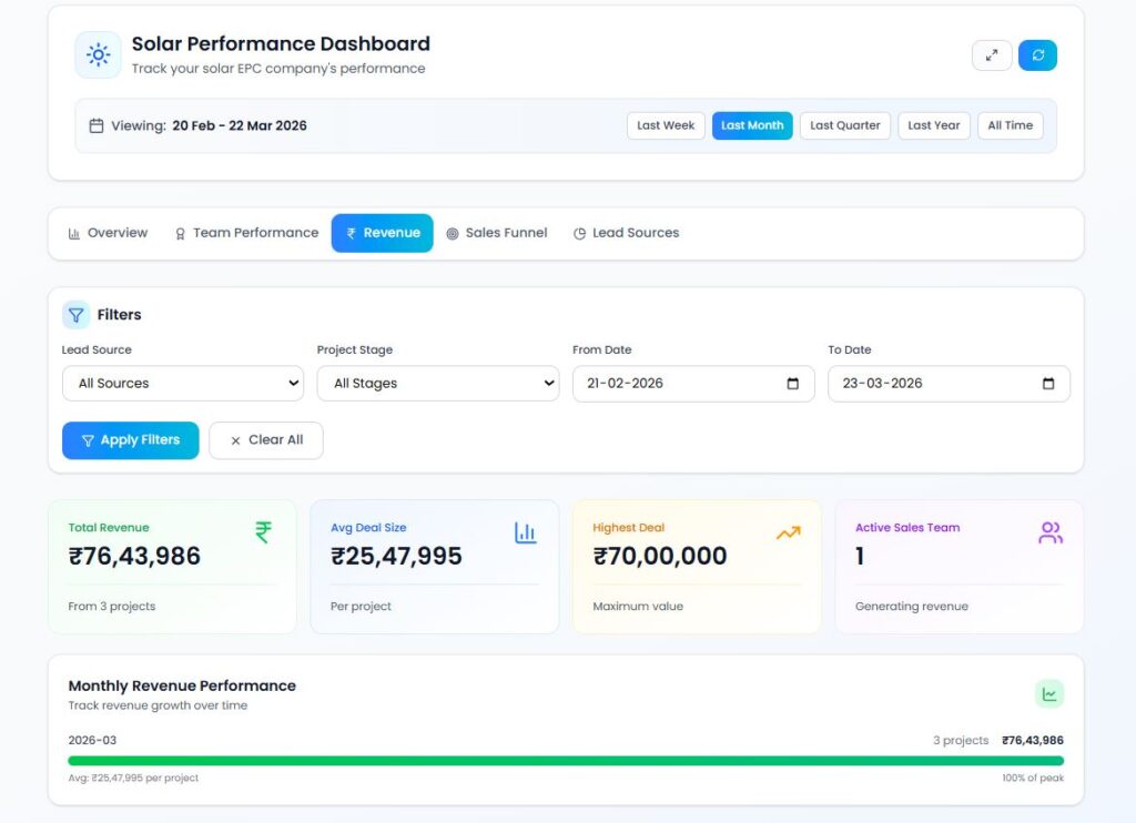 SolarNova is purpose-built for solar EPC companies, developers, and O&M teams to manage leads, automate proposals, streamline project execution, control inventory, track payments, and monitor plant performance — all from a single intelligent dashboard.